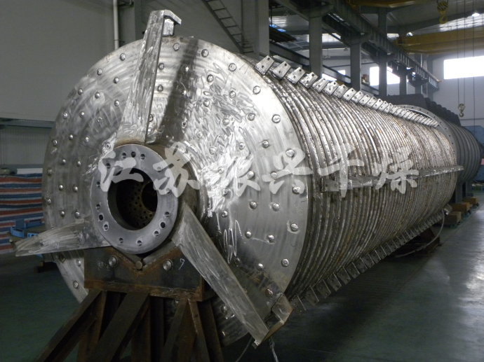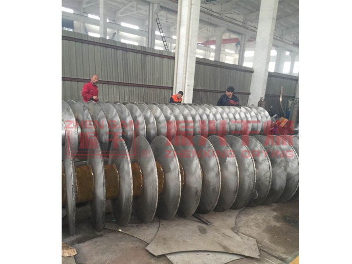 空心軸上密集排列著中空?qǐng)A盤片,振干以熱傳導(dǎo)為主要手段的干燥器,依靠葉片、主軸或熱壁的熱量與污泥顆粒的接觸、攪拌擠壓進(jìn)行換熱,其中的熱量來(lái)自填充在其中的熱介質(zhì),熱介質(zhì)經(jīng)空心軸流經(jīng)圓盤片。單位有效容積內(nèi)傳熱面積很大,熱介質(zhì)溫度從-40℃到320℃,可以是水蒸汽,也可以是液體型:如熱水、導(dǎo)熱油等。間接傳導(dǎo)加熱,沒(méi)有攜帶空氣帶走熱量,熱量均用來(lái)加熱物料。熱量損失僅為通過(guò)器體保溫層向環(huán)境的散熱。