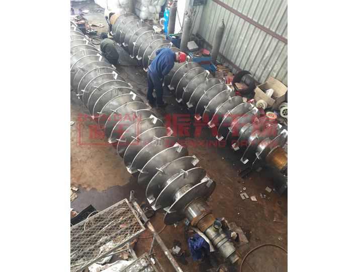 1) 根據(jù)污泥特性及工藝要求,a.振興干燥為防止?jié)窨諝庠趫A盤干燥機(jī)內(nèi)及在排風(fēng)管內(nèi)冷凝結(jié)露,要求在干燥機(jī)進(jìn)風(fēng)口設(shè)空氣換熱器將空氣預(yù)熱后進(jìn)入。 B. 振干為防止物料被擠入密封填料內(nèi)對(duì)主軸產(chǎn)生摩擦而破壞主軸表面光潔度而造成對(duì)填料的快速磨損,導(dǎo)致密封效果不好漏粉,設(shè)備制造過(guò)程中除了要確保制作精度(主軸與密封箱的同心度,端蓋與軸的垂直度等)外,要求在二端設(shè)置反向推料螺旋片讓箱體內(nèi)的物料不在端蓋處對(duì)軸封產(chǎn)生擠壓。